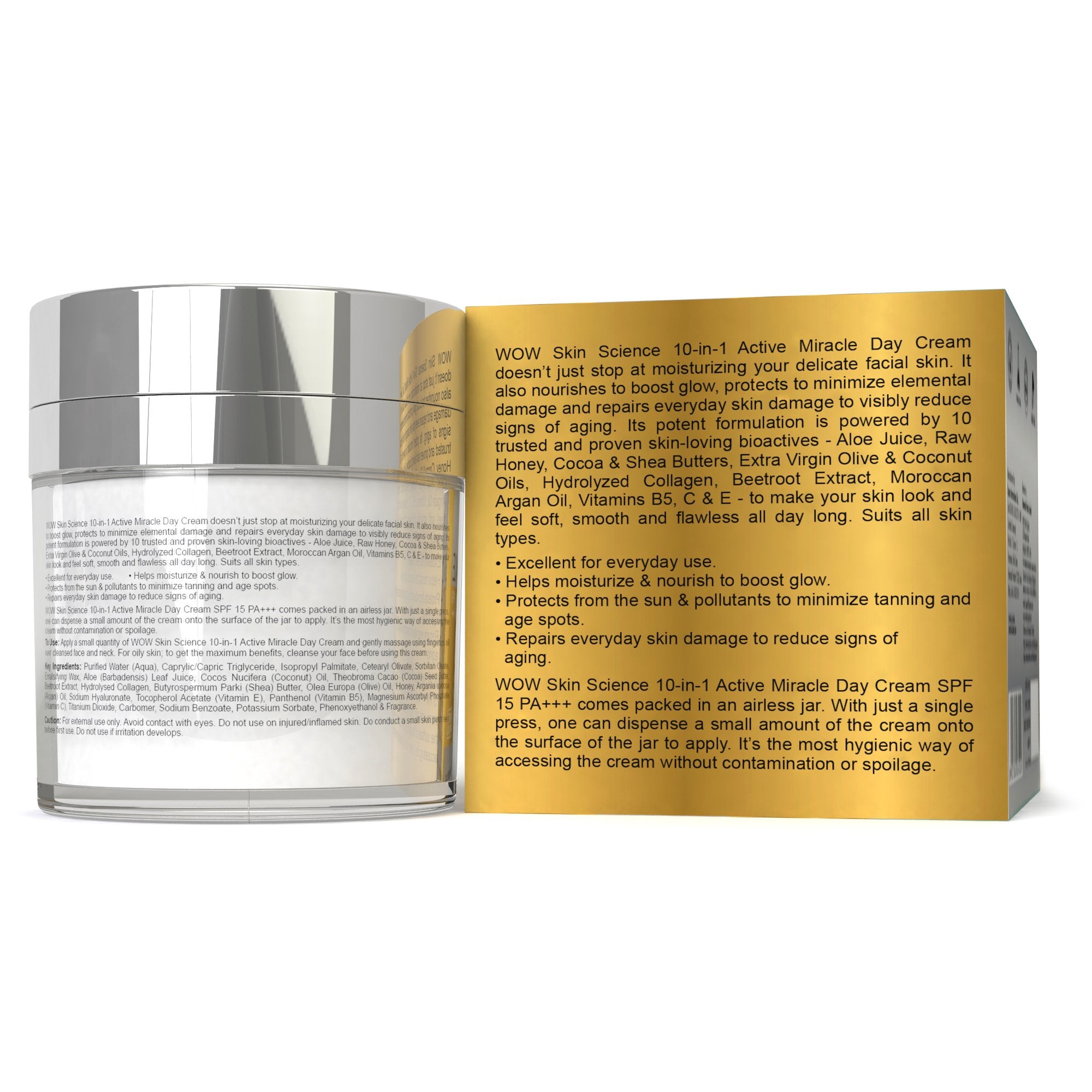 WOW Skin Science 10-in-1 Active Miracle Face Cream comes with SPF 15 PA+++, and is enriched with potent bioactives blended together to moisturize, nourish, protect, brighten and rejuvenate your skin