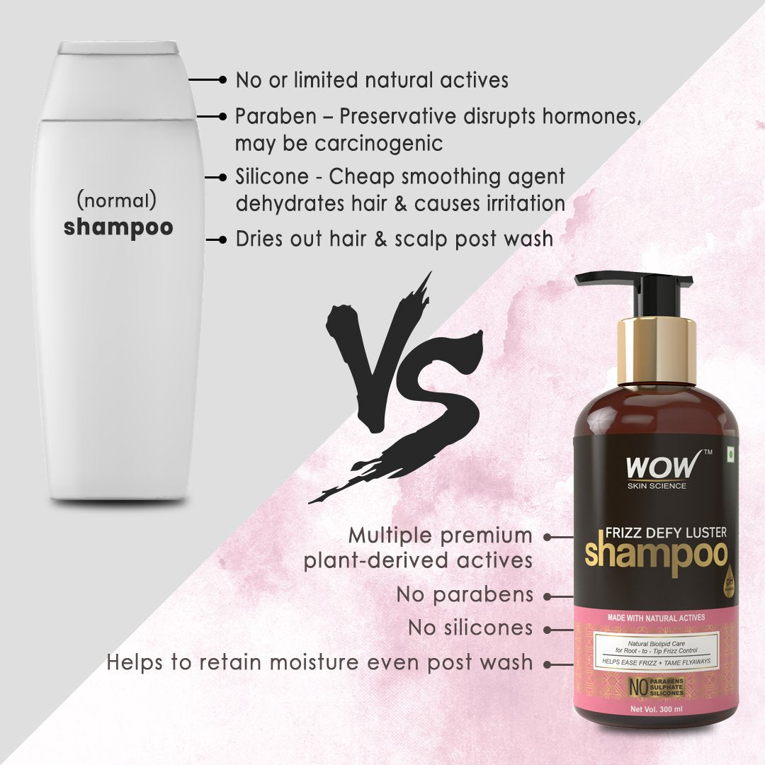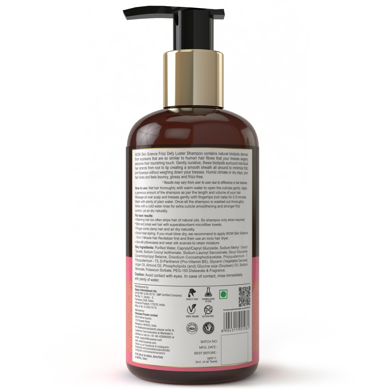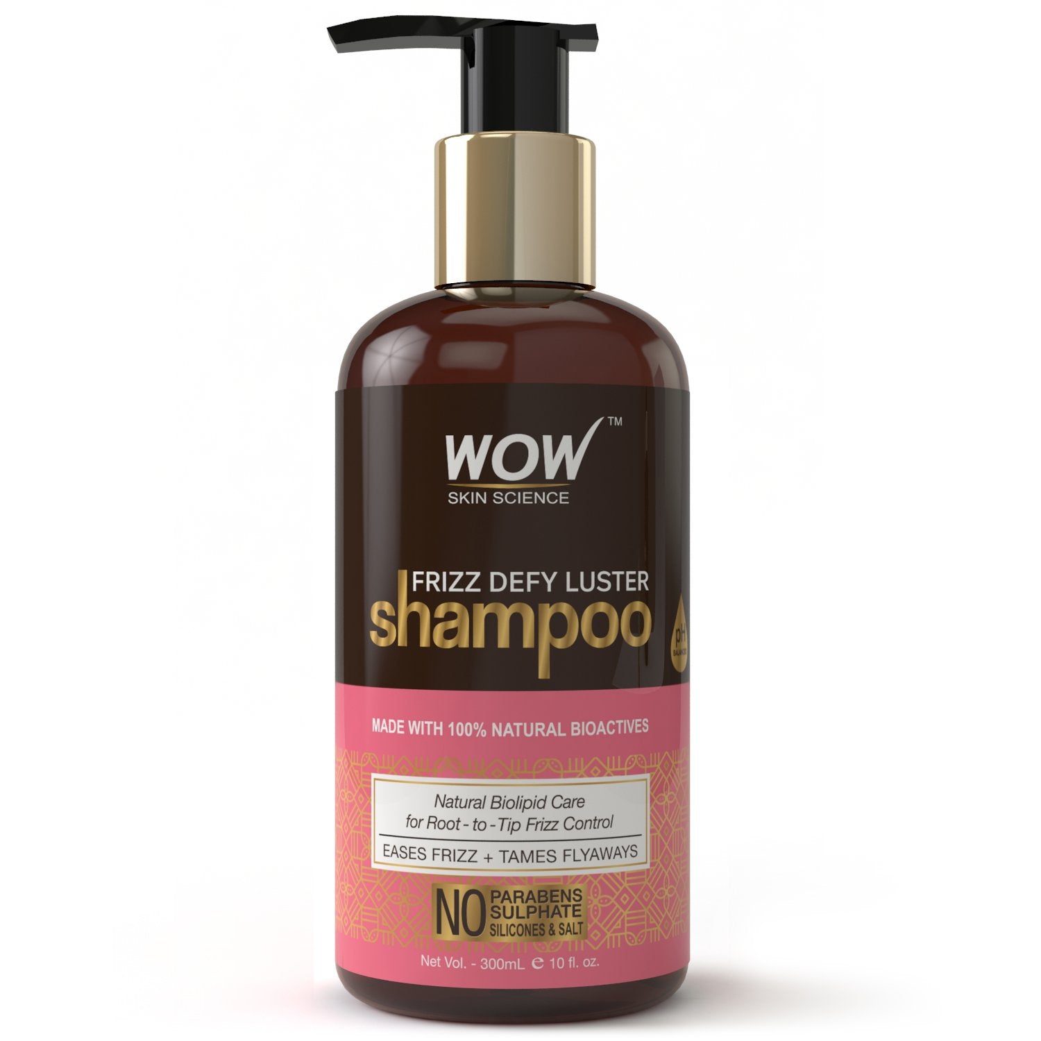WOW Skin Science Frizz Defy Luster Shampoo is a premium, gentle anti-frizz shampoo infused with the goodness of concentrated Soybean Biolipids, Argan Oil, Almond Oil & Soybean Oil.