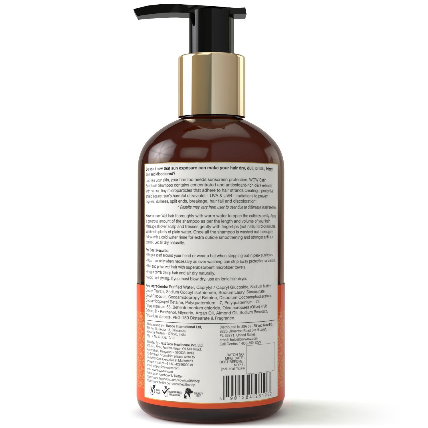 WOW Skin Science Satin Sunshade Shampoo is a specialist sunscreen shampoo infused with Concentrated Olive Extracts with natural microparticles that form a protective shield around the hair strands, against UVA & UVB radiations - preventing dryness, dullness, split ends, breakage, hair fall & discoloration. It also contains Argan and Almond Oils for extra nourishment for hair and scalp.