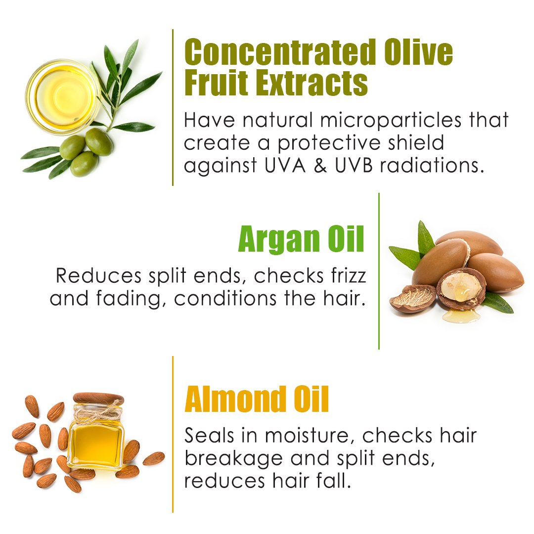 - Enriched with Concentrated Olive Fruit Extracts, Argan Oil & Almond Oil.