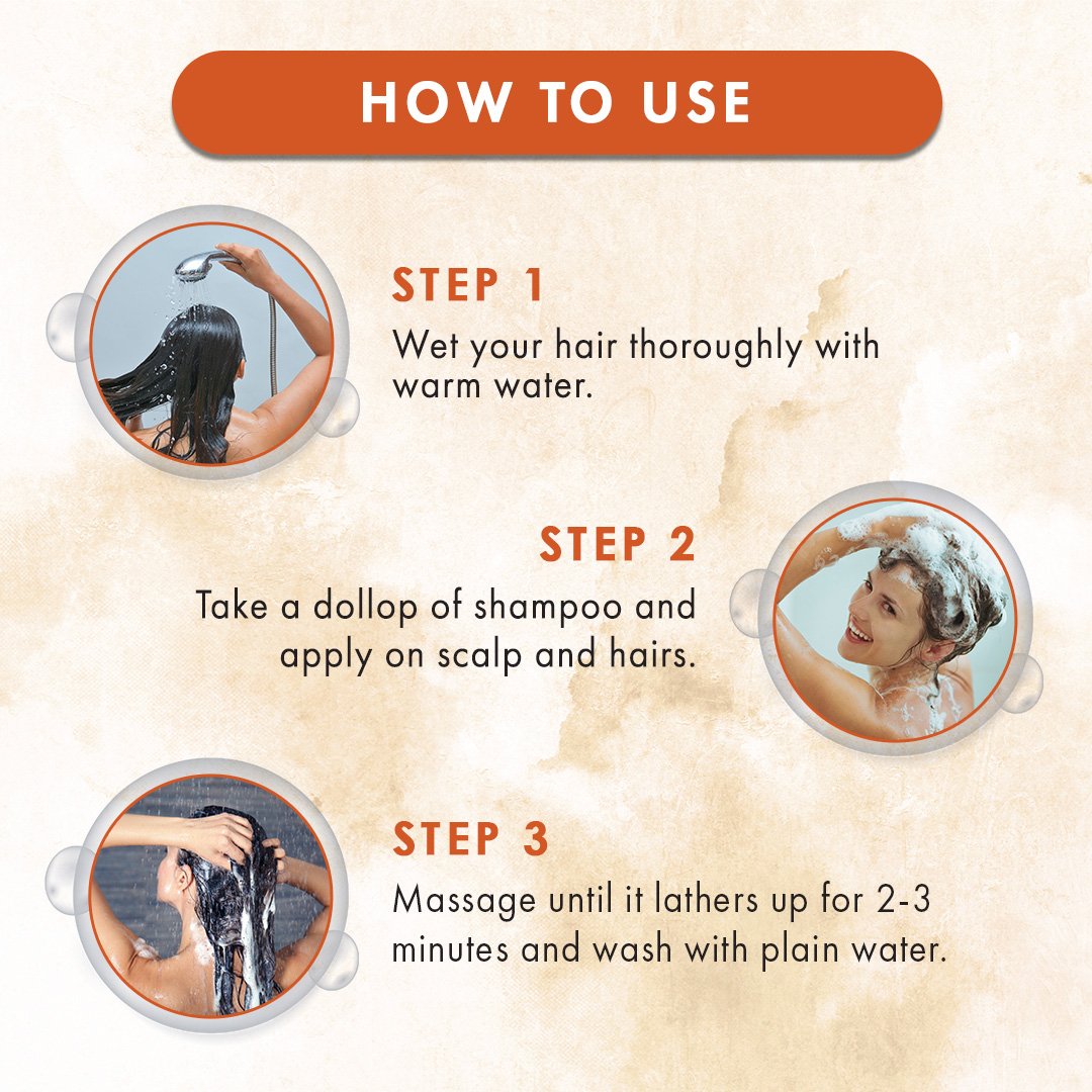 Wet hair thoroughly with warm water. Take a dollop of shampoo in your palm, rub together to emulsify it. Apply on your scalp and hair length.